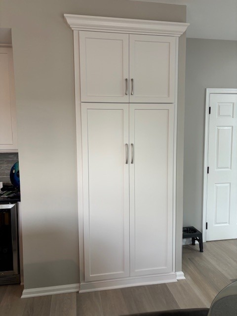 Pull-out double trash cabinet beside beverage refrigerator in Ambler, PA